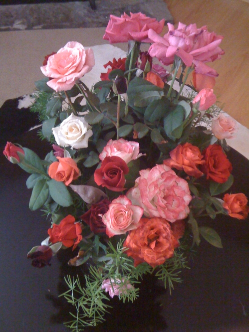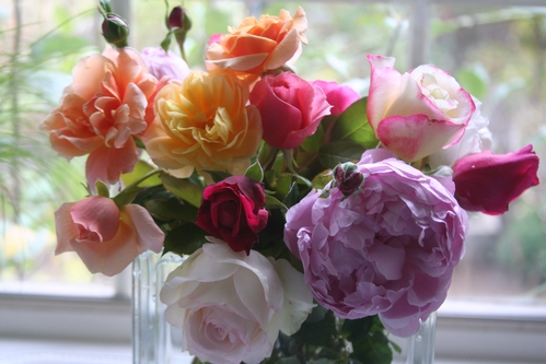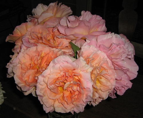 Fall Bouquet: Double Delight, Moonstone, Cl. Pinkie, Breathless, Tamora, Cl. Autumn Sunset, Graham Thomas, Tradescant, Mme. Alfred Carriere, etc. -