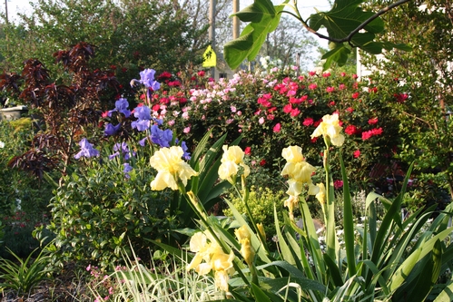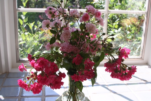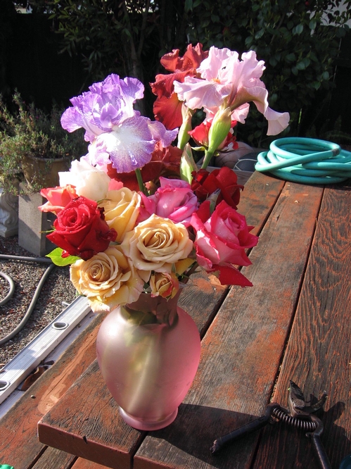 Pink Frosted Vase - Honey Dijon tree roses bottom center; then clockwise Ingrid Bergman HT, Medallion HT, Garden Party HT, Cl. Paradise, & Love. Irises blooming in background. -