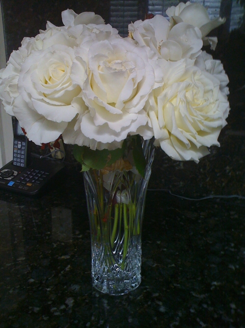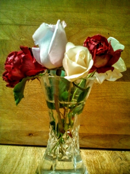 Asst clipped buds... Climbing Don Juan, Blue Moon bush rose, & Climbing Iceberg represented here in a little Waterford bud vase I picked up in anticipation of the coming gardening season. The Waterford pattern is one of the Lismore incarnations (there are so many of them now!). Just to give you an idea how well the two items go together. Youre liable to see me arrange roses in an old jelly jar too like Grandma used to do when I was a kid back in the 1960s. I'm just sayin' :) -